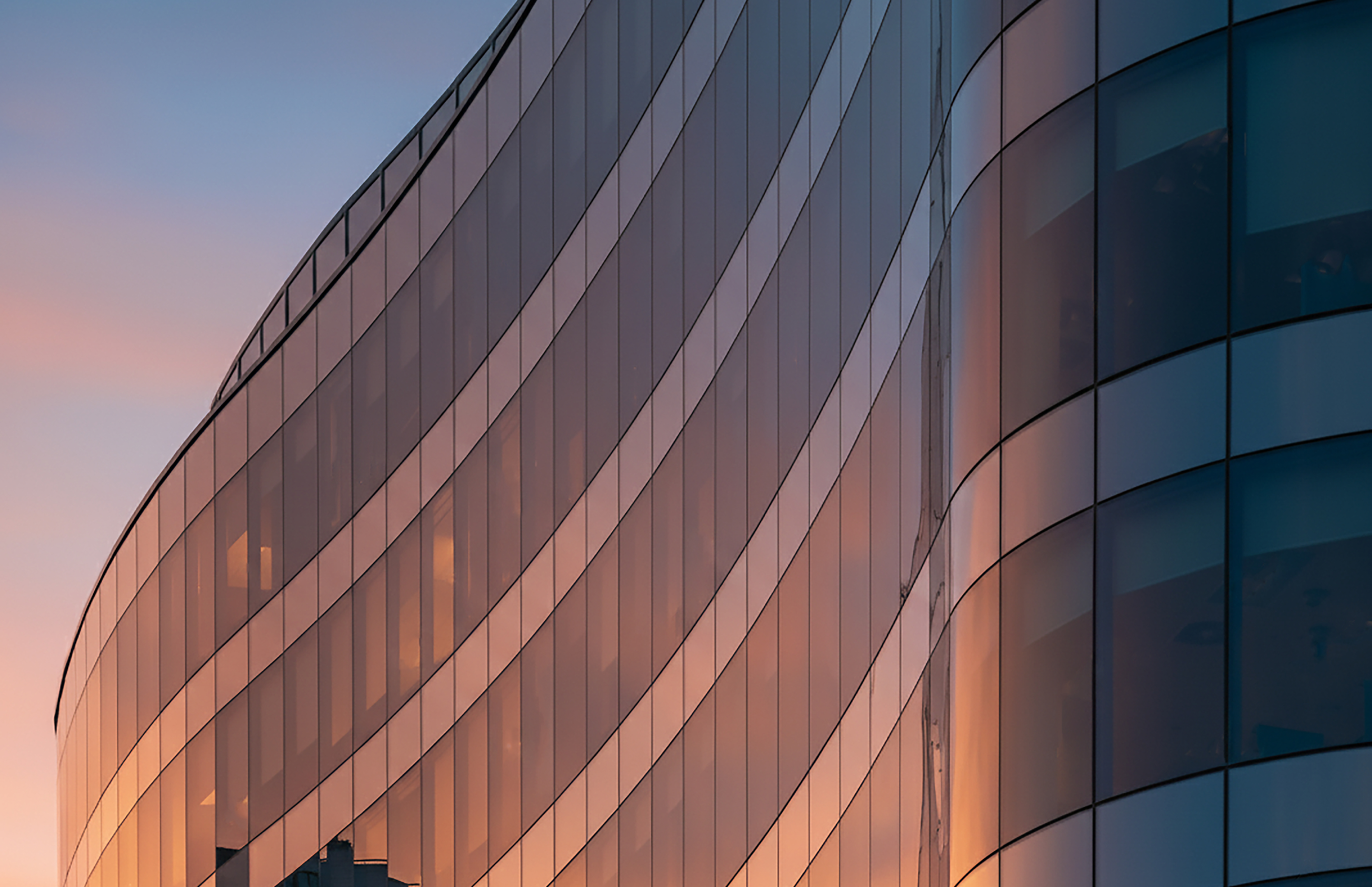 A smoked glass curtain wall encases the curve, engineered for high performance, low energy demand, and visual impact.